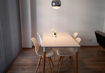 Amplia terraza de uso exclusivo de 40 m2 en el piso 14, con vista al río. Cocina independiente pero vinculada al comedor por una barra pasaplatos con vista parcial al río. Espacioso baño.